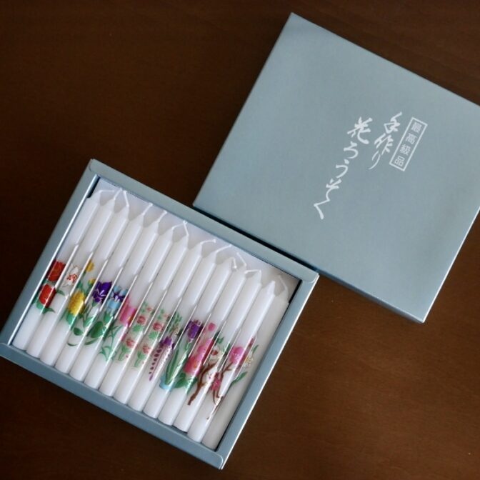 一年を通して咲く十二の花々と、金色の蓮花。人気の花和ろうそくシリーズと同じ技法で、花々の美しさを一本一本に丁寧に映しました。