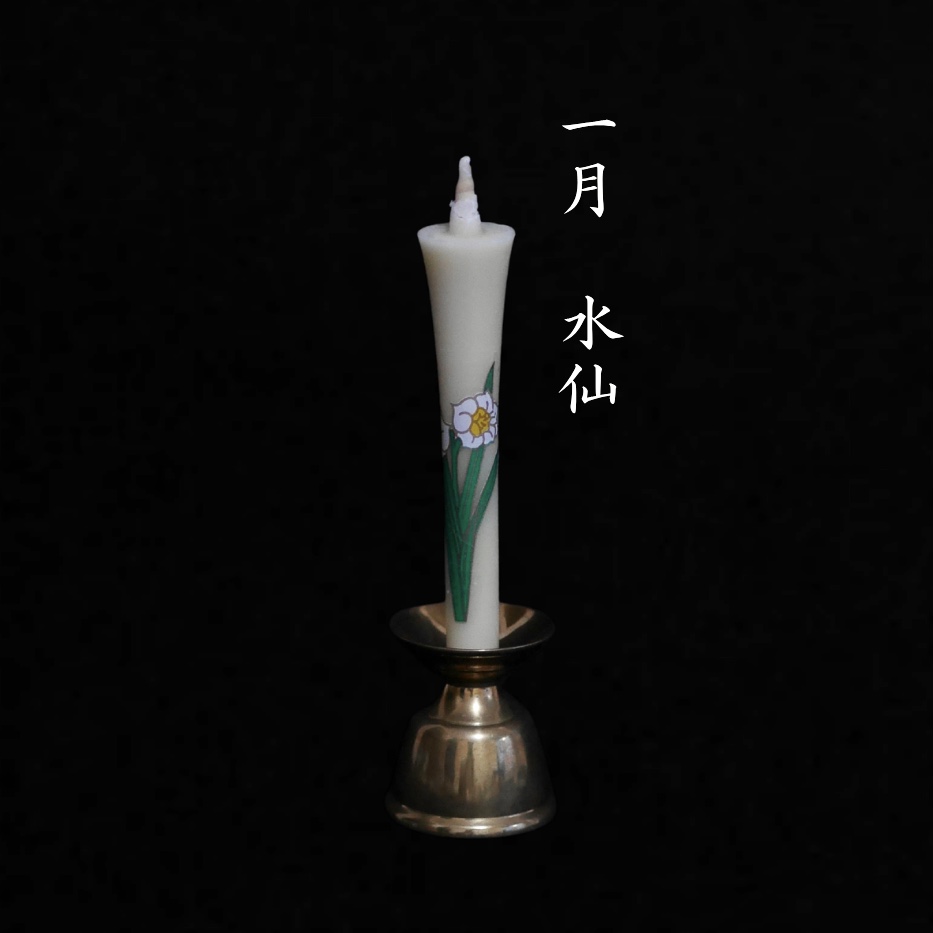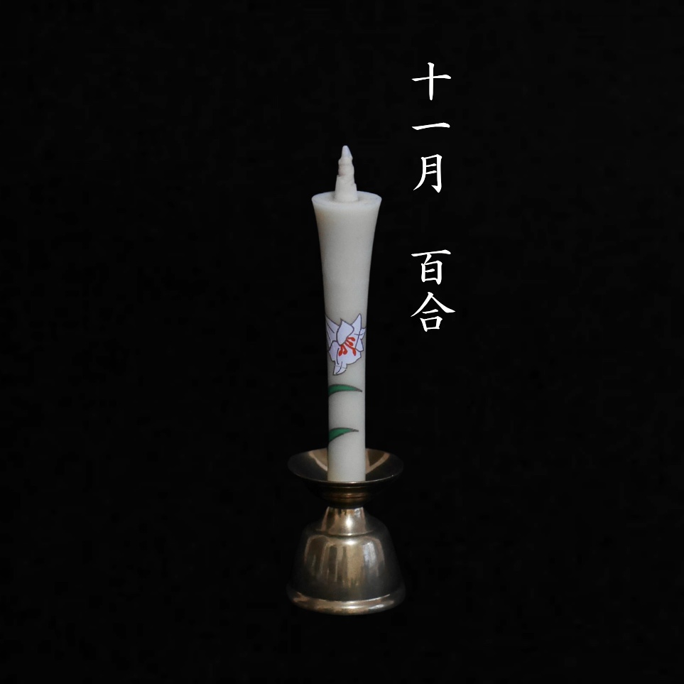 一年を通して咲く花々を、和ろうそくにうつしました。金の縁取りが静かに光る花絵が、揺らめく炎とともに心を癒します。