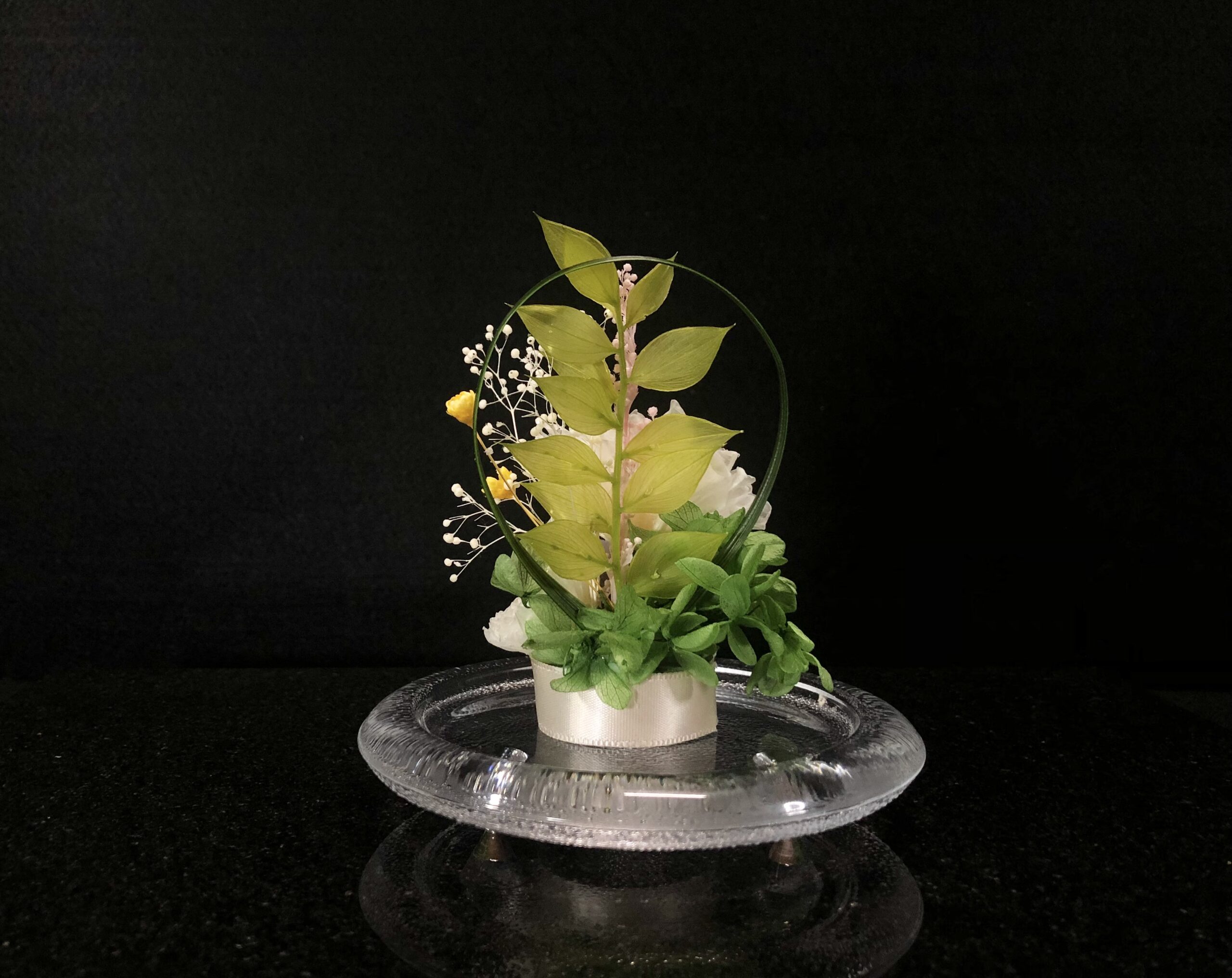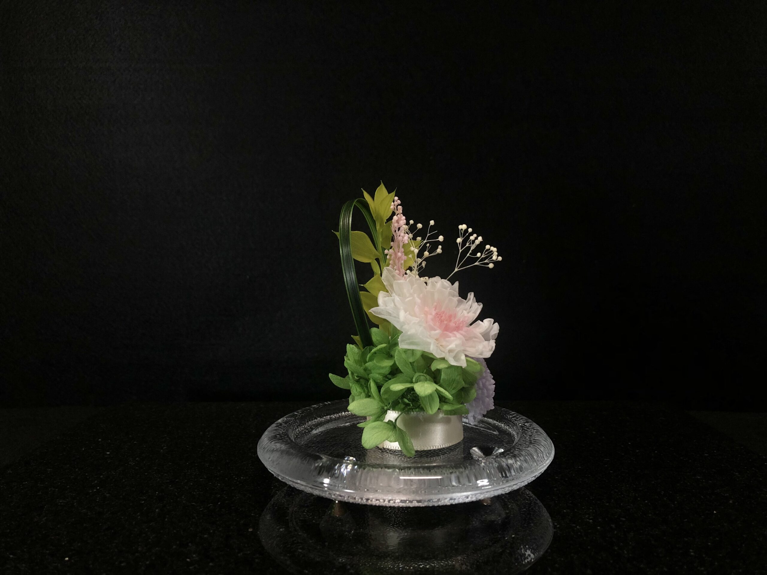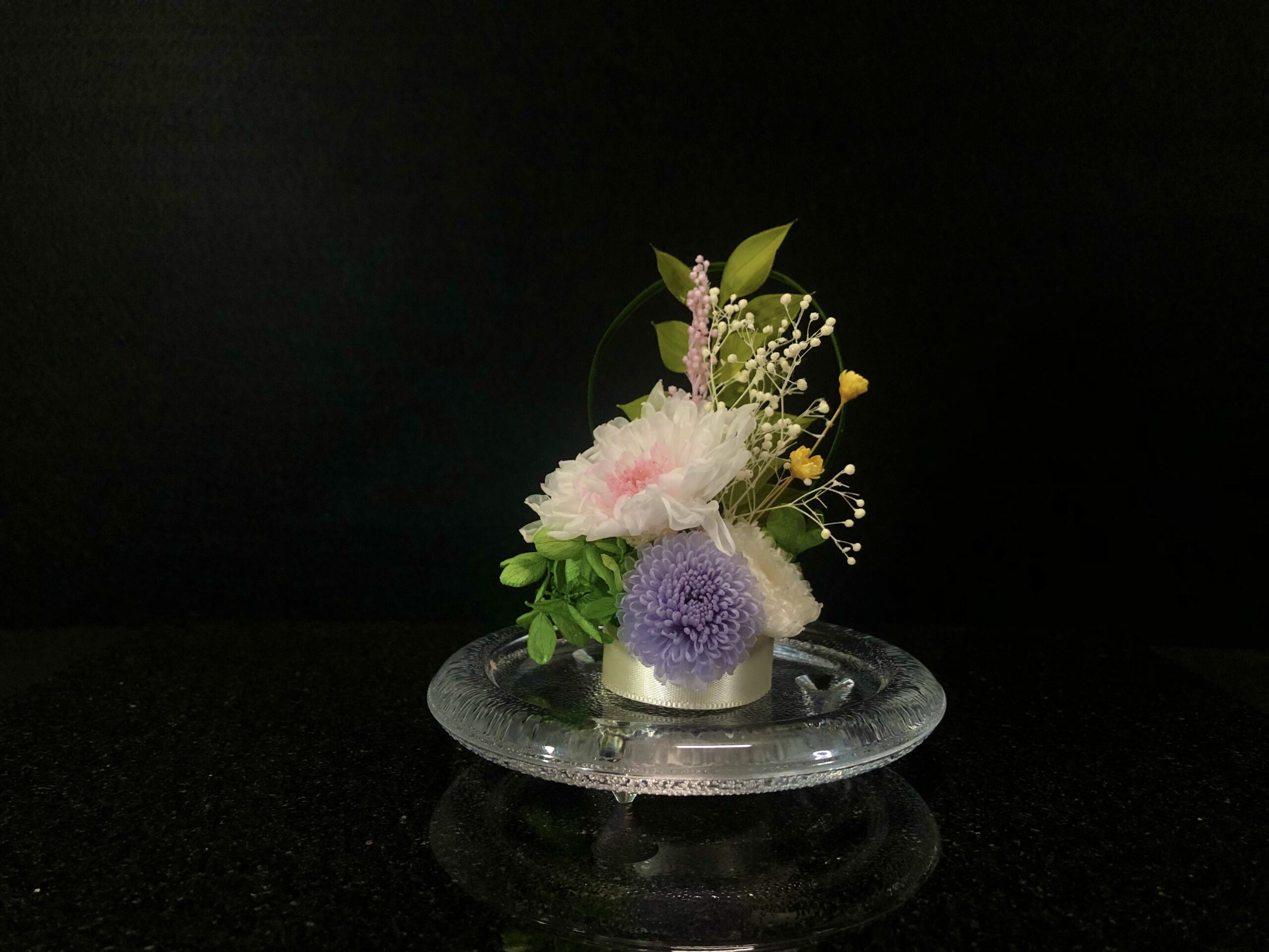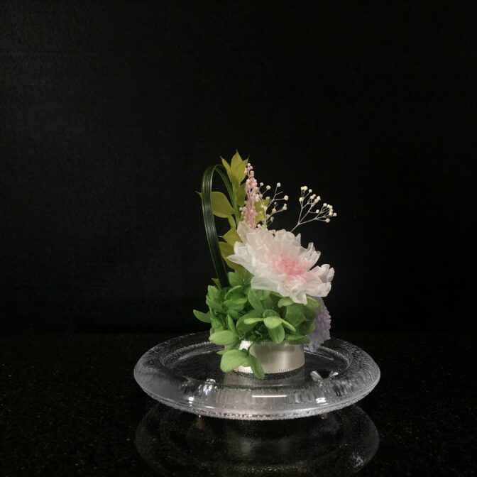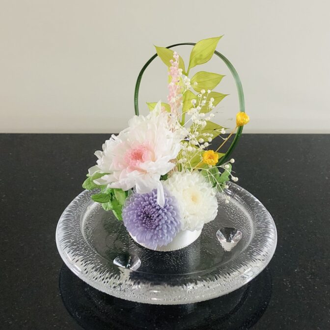 生花を加工したプリザーブドフラワーのアレンジメントです。