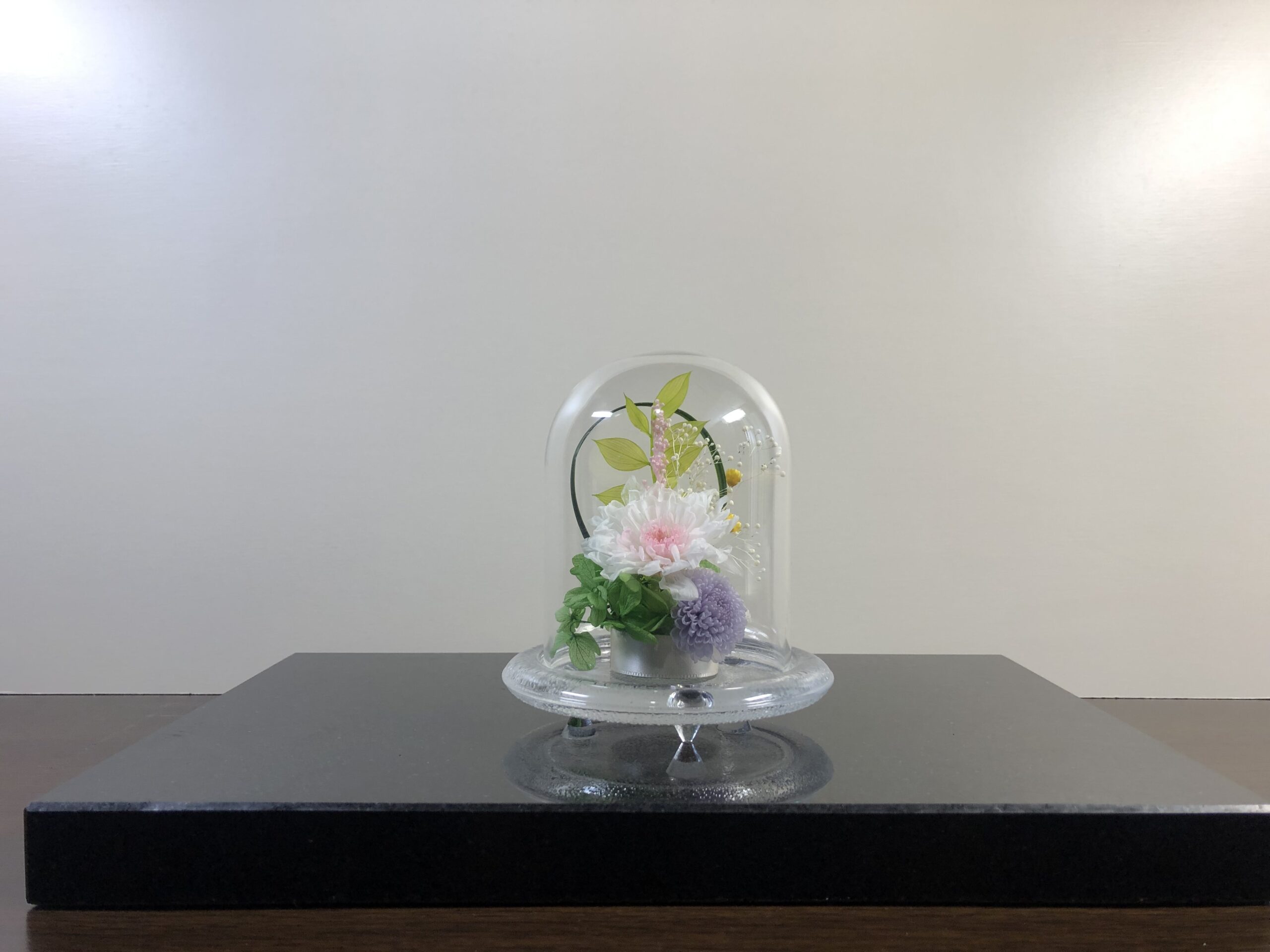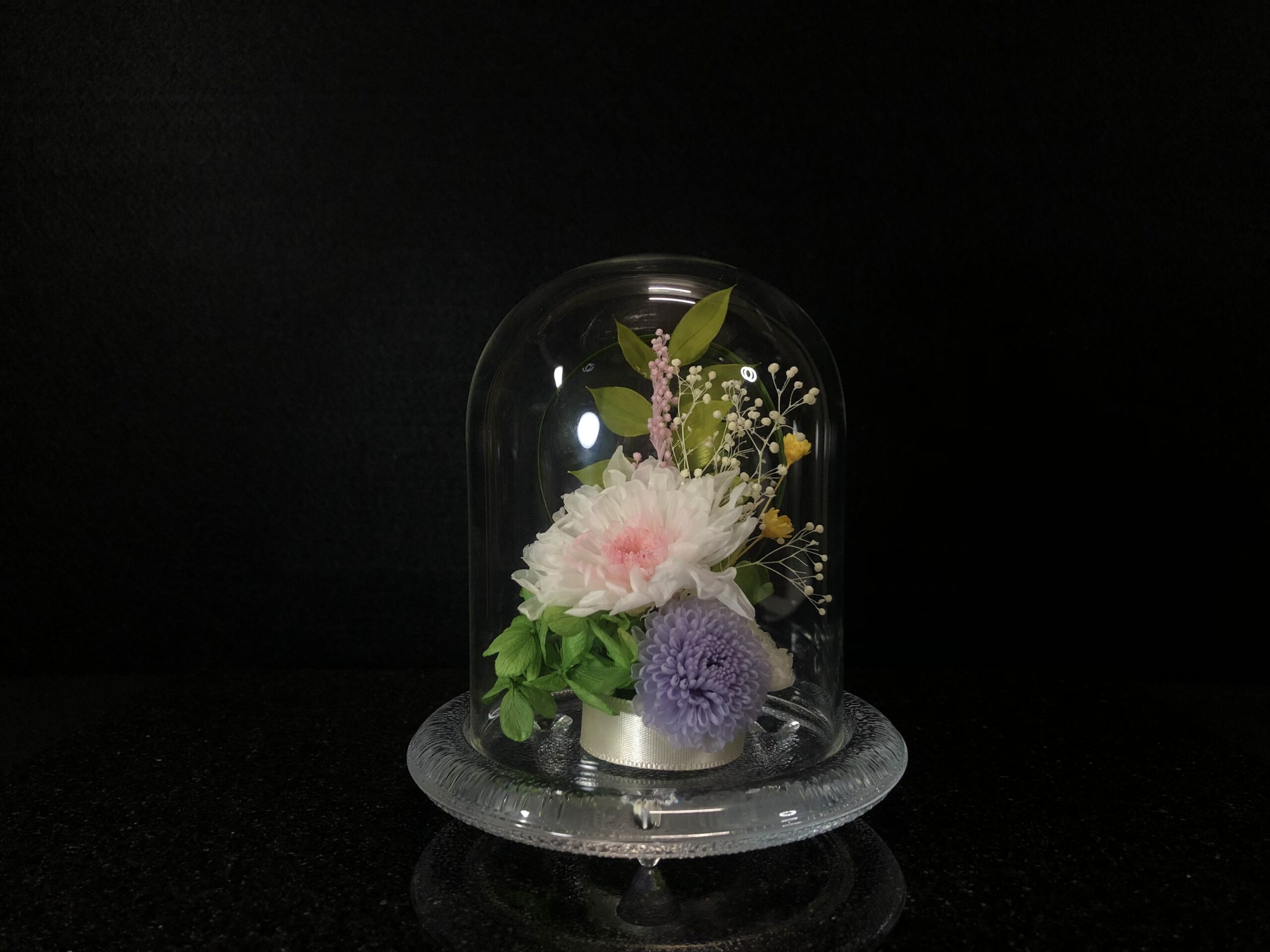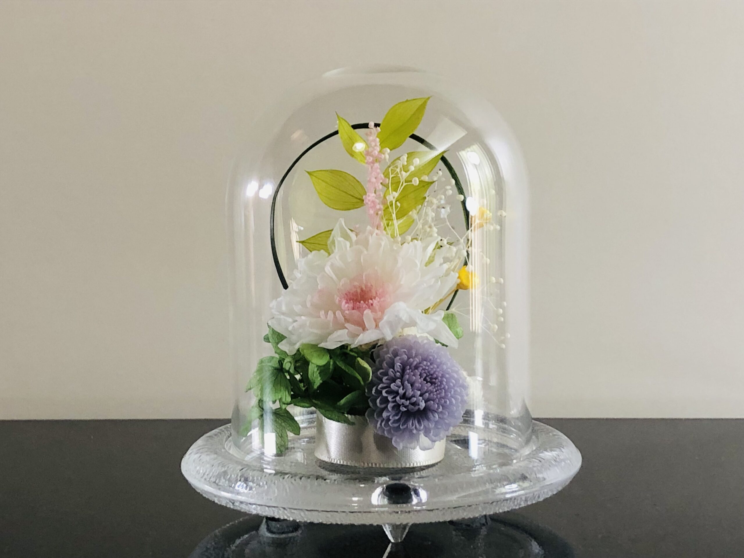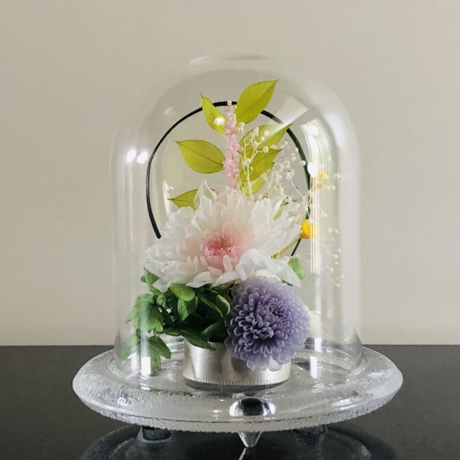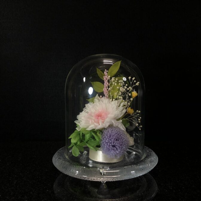 ガラスドームなので、繊細な花びらにつくホコリを気にすることなく、お手入れも簡単です。