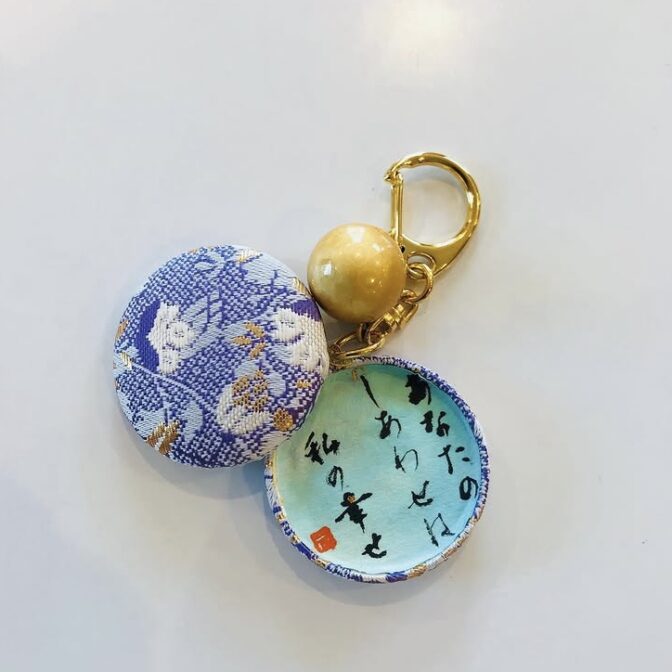 墨丸「すすむ守り」は大切な人のご遺骨を収める金属製カプセルを備えたペンダントです。 豪華な金襴の着物生地で包まれる想いは書家、出水愛子が書き上げたメッセージと大切な写真。
